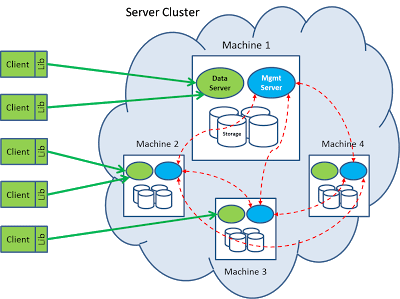 The data server, written in C/C++, is responsible to handle get/set/delete request from the client. The Management server, written in Erlang, is responsible to handle the query traffic from the client, as well as manage the configuration and communicate with other member nodes in the cluster.