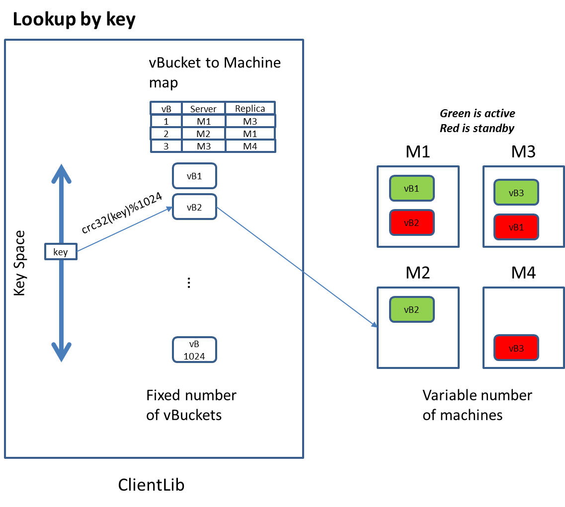 The basic unit of data storage in Couchbase DB is a JSON document (or primitive data type such as int and byte array) which is associated with a key. The overall key space is partitioned into 1024 logical storage unit called “virtual buckets” (or vBucket). vBucket is distributed across machines within the cluster via a map that is shared among servers in the cluster as well as the client library.